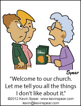 Cartoon of a woman greeter and a couple at church. The woman says, “Welcome to our church. Let me tell you all the things I don’t like about it.”