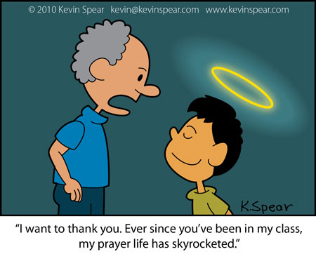Cartoon of a teacher and boy. The teacher says, “I want to thank you. Ever since you’ve been in my class, my prayer life has skyrocketed.”