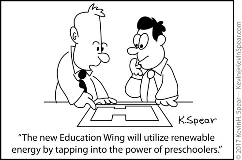 This cartoon has two men looking at plans. One says, “The new Education Wing will utilize renewable energy by tapping into the power of preschoolers.”